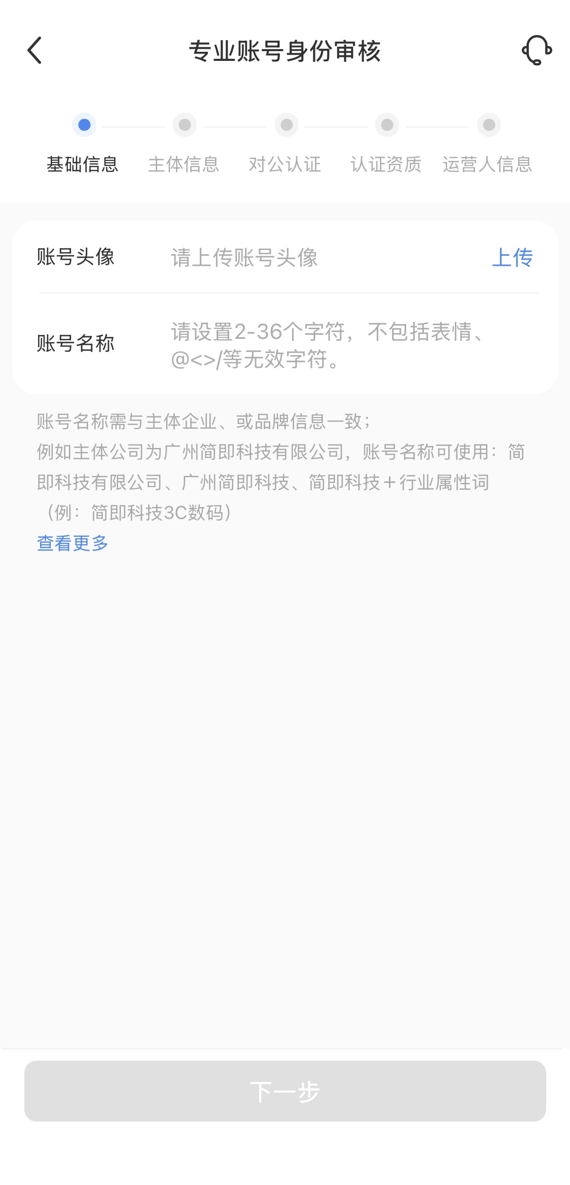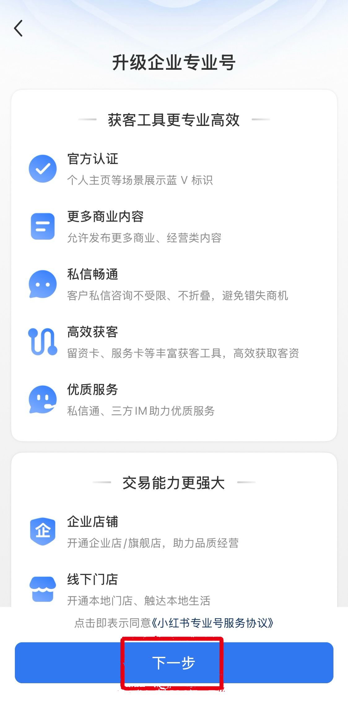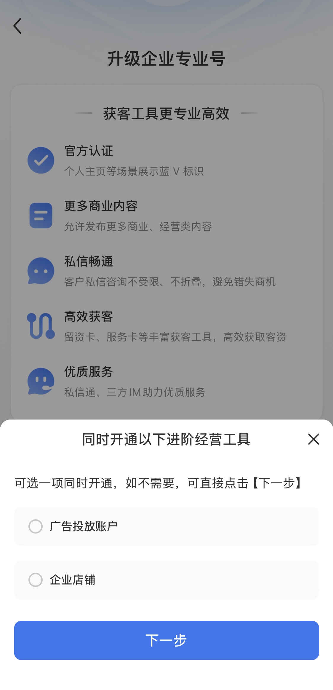 7.必要に応じて、「广告投放账户(広告配信アカウント)」または「企业店铺(企業ショップ)」の経営ツールを同時に開通するか選択します。選択内容を確認後、「下一步(次へ)」をタップします。不要な場合は選択せず、そのまま「下一步(次へ)」をタップしてください。