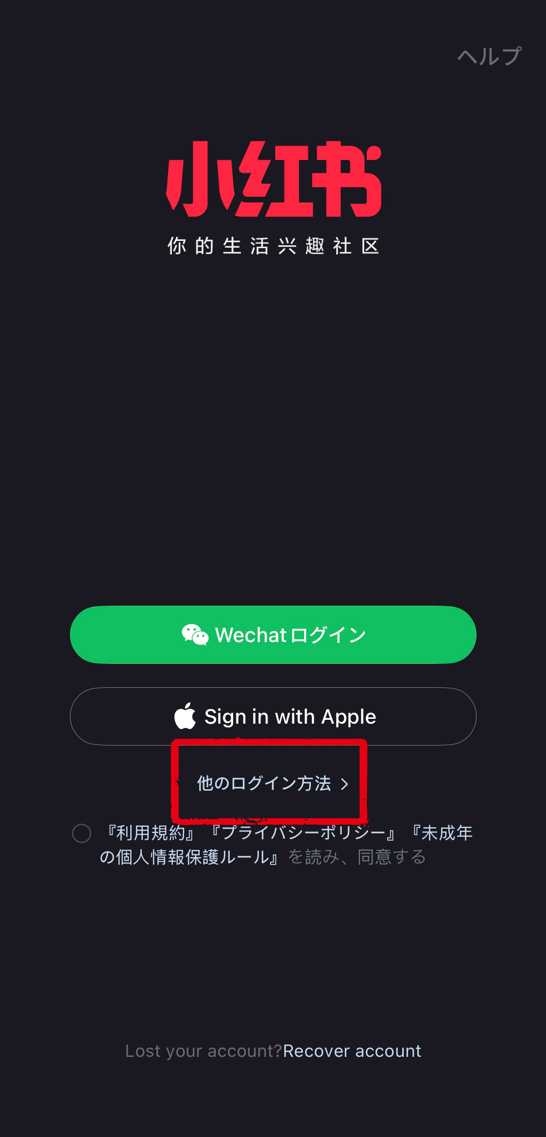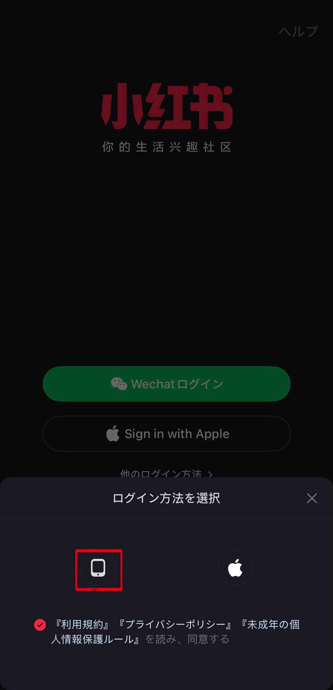 個人アカウント版の小紅書のアカウント登録は、電話番号、AppleアカウントやWeChatアカウントを使って登録することができます。
