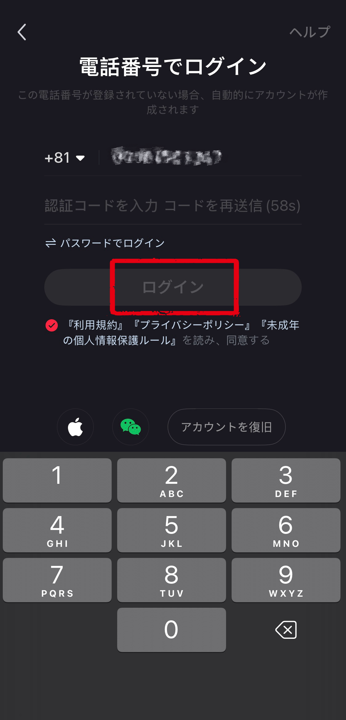 電話番号で登録した場合認証コードが届くので、それを電話番号の下の欄に入力し「ログイン」ボタンをタップし、登録します。