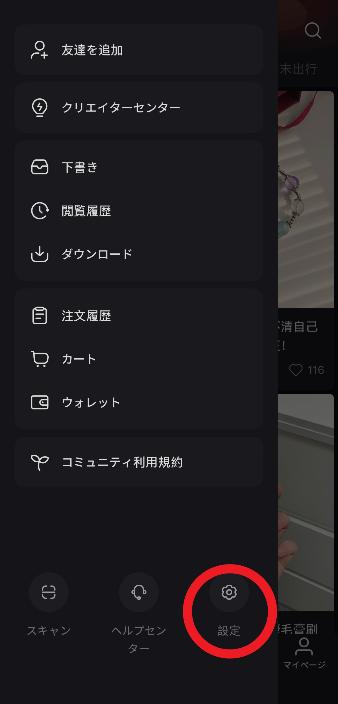 2.右下の「設定」をタップします。